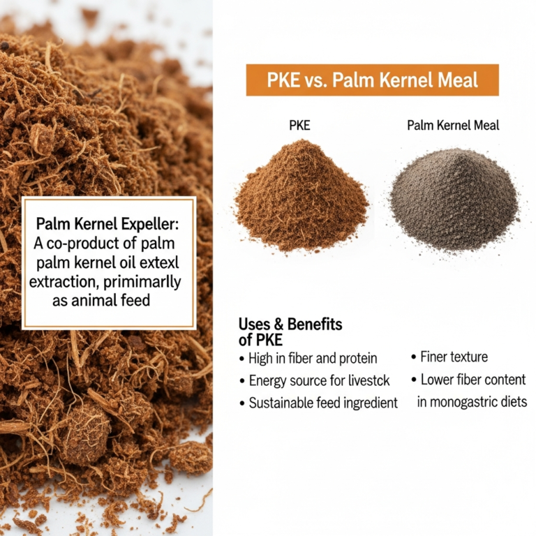 Palm Kernel Expeller, often abbreviated as PKE, is the solid residue left behind after oil extraction from the Palm Kernel. It is produced through a mechanical screw-pressing process and is a valuable by-product of milling operations that produce Crude Palm Oil and Palm Kernel Oil. This resulting “expeller” or “cake” is rich in protein, fiber, and energy, making it an excellent component for livestock feed.